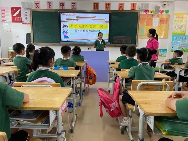 推普周里,五桂山學(xué)校一至六年級(jí)都開展了“推普誦經(jīng)典,共筑中國(guó)夢(mèng)”的經(jīng)典誦讀大賽。一年級(jí)的同學(xué)童聲稚嫩,卻能瑯瑯上口誦讀著《大風(fēng)歌》 《詠鵝》 《江南》等小學(xué)生必背的75首古詩(shī),這也得益于學(xué)校一貫重視學(xué)生中華優(yōu)秀傳統(tǒng)文化的培養(yǎng)與傳承。中高年級(jí)的同學(xué)們自信滿滿地背誦著自己喜愛的古詩(shī)。詩(shī)詞大會(huì)的舉辦,讓同學(xué)們領(lǐng)悟到了中華詩(shī)詞的獨(dú)特魅力,領(lǐng)略到華夏文化的博大精深。更明白了說好普通話的重要意義,關(guān)注了普通話的標(biāo)準(zhǔn)發(fā)音,更嚴(yán)格地要求自己說話字正腔圓,提高了語(yǔ)言表達(dá)的能力,更加熱愛祖國(guó)的文字。